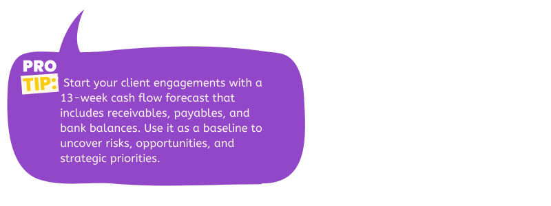 Cash flow forecasting is my go-to starting point when working with clients. It’s the easiest way to train business owners to understand the financial side of their business while setting the stage for deeper, strategic conversations.